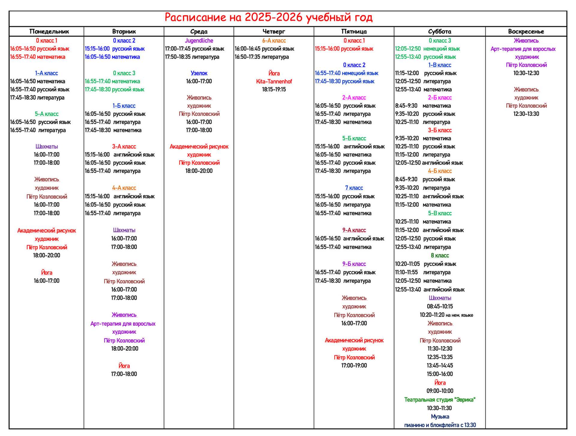 Das Bildungszentrum „Alpha“ bietet ein breites Kursangebot: Unterricht mit kleinen Kindern nach Alter, Vorbereitung auf die Schule, russische Sprache und Literatur, Hilfe in Schulfächern: Mathematik, Englisch, Deutsch, Malen, Schach, Nähkurs, Yoga, Theater. Wir veranstalten thematische Feste. Lasst uns mit „Alpha“ aufwachsen! Mehr Informationen...