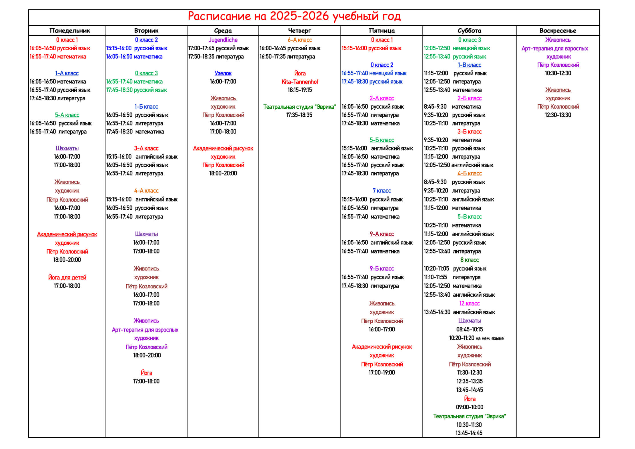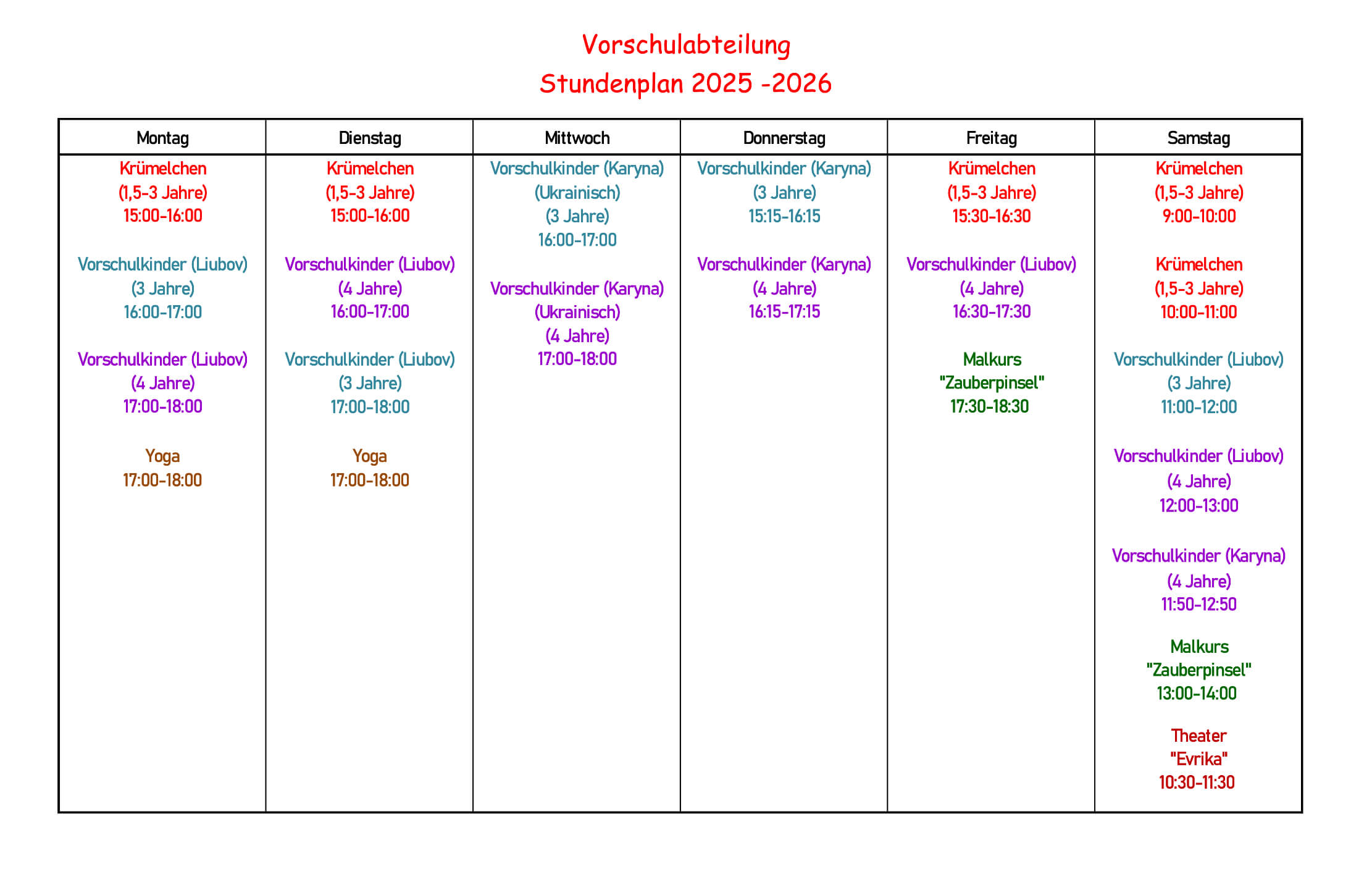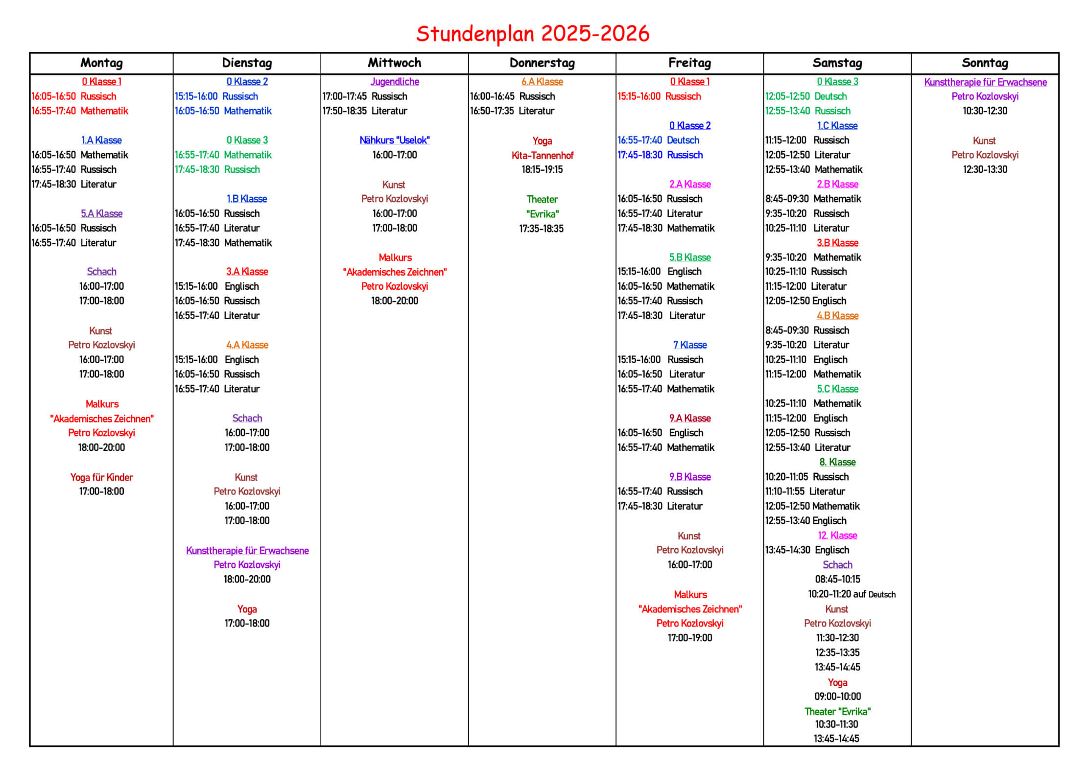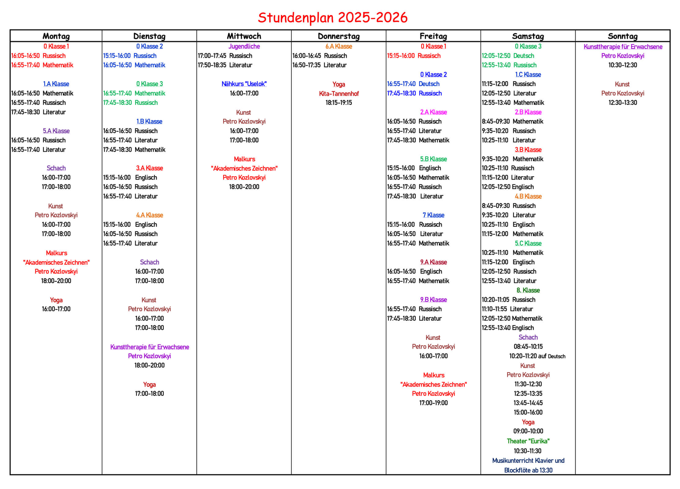 Das Bildungszentrum „Alpha“ bietet ein breites Kursangebot: Unterricht mit kleinen Kindern nach Alter, Vorbereitung auf die Schule, russische Sprache und Literatur, Hilfe in Schulfächern: Mathematik, Englisch, Deutsch, Malen, Schach, Nähkurs, Yoga, Theater. Wir veranstalten thematische Feste. Lasst uns mit „Alpha“ aufwachsen! Mehr Informationen...
